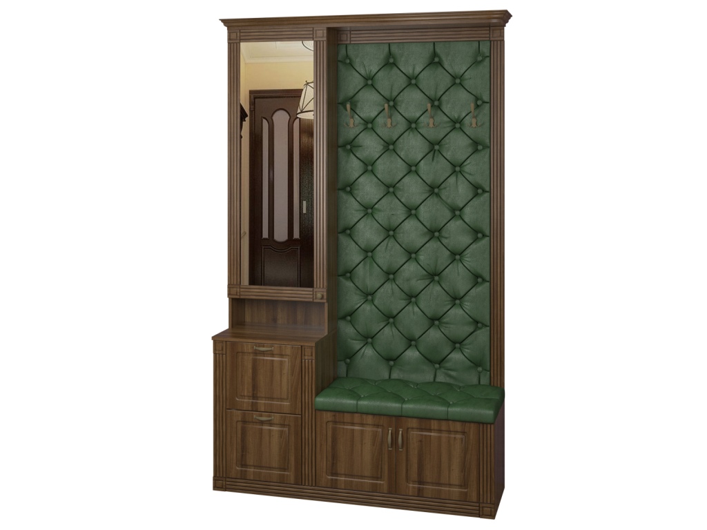 Используемый материал: корпус - ламинированное ДСП 16 мм; зеркало; фасады, карниз и пилястры - МДФ; ЛДВП. Мягкая панель декорирована каретной стяжкой. Доступен выбор вариантов ткани для обивки: это может быть велюр, рогожка или экокожа различных цветов.