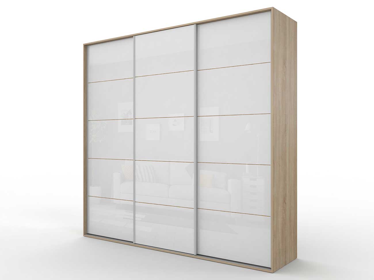 В базовую комплектацию шкафа входит кромка 0.4 мм, ручки торцевые, ламинированное ДСП 16 мм, ламинированное ДВП, направляющие Версаль, ходовые ролики РКМ-70, цветное стекло