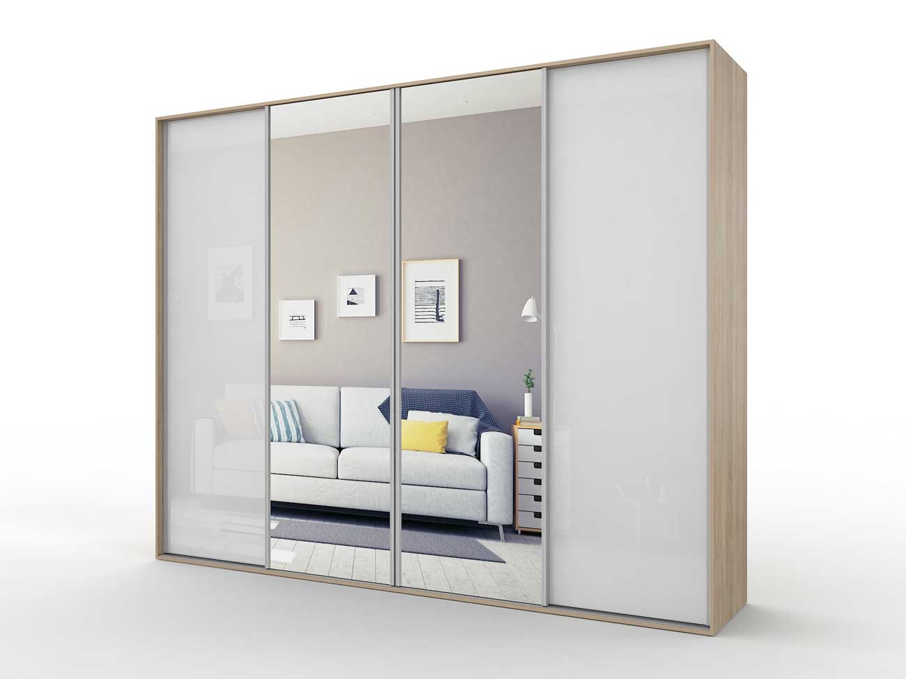 В базовую комплектацию шкафа входит кромка 0.4 мм, ручки торцевые, ламинированное ДСП 16 мм, ламинированное ДВП, направляющие Версаль, ходовые ролики РКМ-70, цветное стекло, зеркала