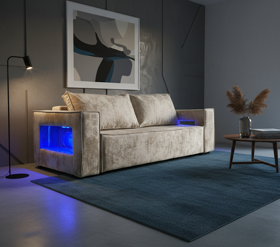 Диван еврокнижка "Лофт люкс плюш" бежевый с подсветкой
