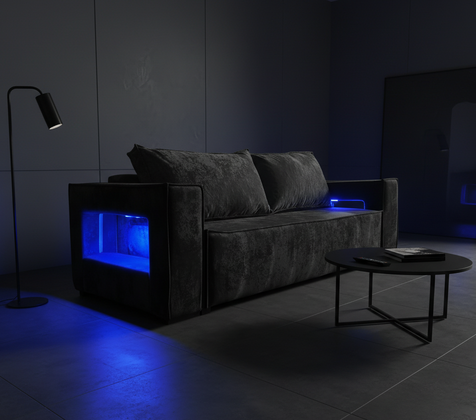 Диван еврокнижка "Лофт люкс плюш" черный с подсветкой